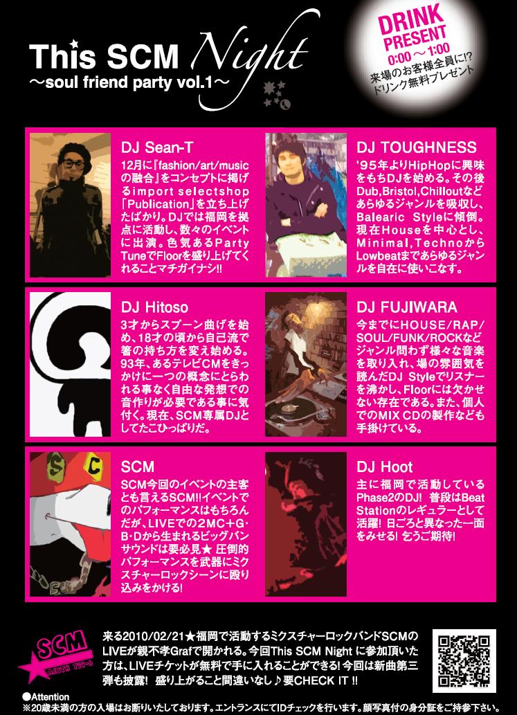 みなさん♪こんばんわ~夜も更けてきました。&寒い・・・まさに冬真っ只中みなさんどうお過ごしでしょうか?SCMは2010/01/23に開催されるEVENT! This SCM Nightに向けて大忙し中です。よ♪今回はいろーんなアーティストと組んでやりまっせ!どんなイベントか気になるのではないでしょうか?アーティストの顔ぶれはこんな感じ!ちなみに今回のフライヤーのデザインは福岡で活動しているdesigner「outside」の提供です★designer「outside」のブログもチェックしてみて♪http://ameblo.jp/insideout-dm/まっ百聞は一見にしかずですかね♪うちSCMのDJ、DJ Hitoso RemixのLong way 少しですが聞いてみてくださいなあっ聞くので「百聞は一見にしかず」では無いな(笑)どうですかぁ~本番は盛り上がること間違いない!です!チケットの購入は急いでくださいね◎売り切れる可能性があるので!当日はみんなで楽しみましょうでは今日はこの辺で See you♪あっそうそう今回EVENTに来てくれた方は特典があるんですよ◎当日キャッシャーで受け取ることができます!期待しててね。っとでは今度こそ See you★